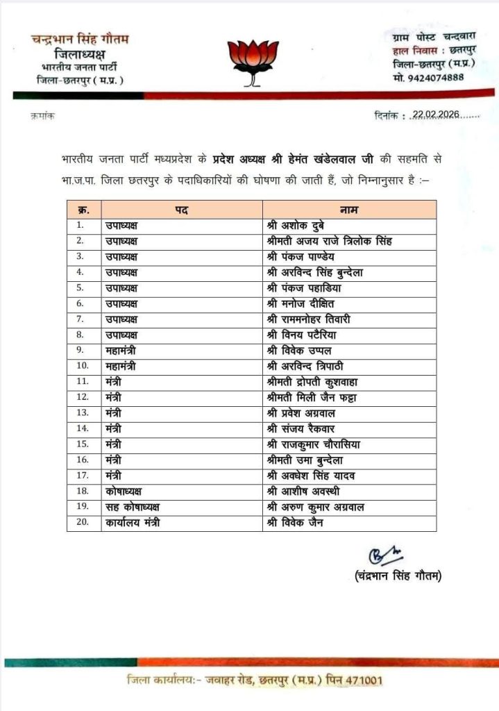 इसी तरह भिंड और छतरपुर में भाजपा ने जिला कार्यकारिणी की घोषणा भी कर दी है। भिंड में 31 लोगों को जिम्मेदारी सौंपी गई है। वहीं छतरपुर में 20 पदाधिकारियों की घोषणा की गई है।