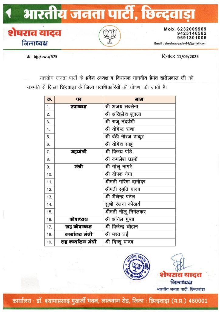 शिखिल ब्यौहार, भोपाल। मध्य प्रदेश में बीजेपी ने अपनी संगठनात्मक संरचना को और मजबूत करने के लिए छिंदवाड़ा और पांढुर्णा जिले की जिला कार्यकारिणी की घोषणा की है। इसके साथ ही, प्रदेश में अब तक कुल 14 जिलों की बीजेपी जिला कार्यकारिणी घोषित हो चुकी है। इन दोनों जिलों में कार्यकारिणी के चयन को लेकर लंबे समय तक विचार-मंथन चला। सूत्रों के अनुसार, पार्टी आलाकमान ने स्थानीय नेताओं और कार्यकर्ताओं के बीच संतुलन बनाए रखने के लिए गहन मंथन किया।