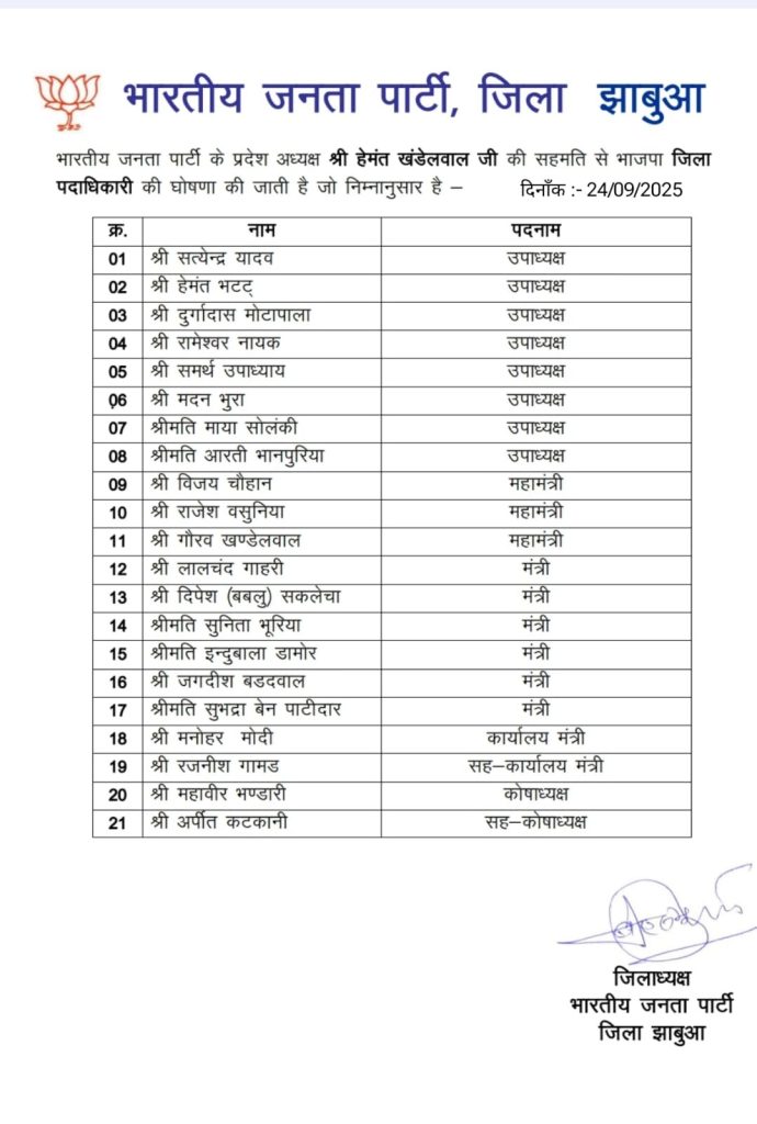 शब्बीर अहमद, भोपाल। मध्य प्रदेश में बीजेपी जिला कार्यकारिणी का सिलसिला जारी है। इसी कड़ी में भारतीय जनता पार्टी ने झाबुआ जिले के पदाधिकारियों का ऐलान किया है। जिला अध्यक्ष भानु भूरिया ने कार्यकारिणी घोषित की है। बीजेपी प्रदेश अध्यक्ष हेमंत खंडेलवाल की सहमति के बाद लिस्ट जारी की गई है। जिसमें 8 उपाध्यक्ष, 2 महामंत्री और 6 मंत्री बनाए गए है।