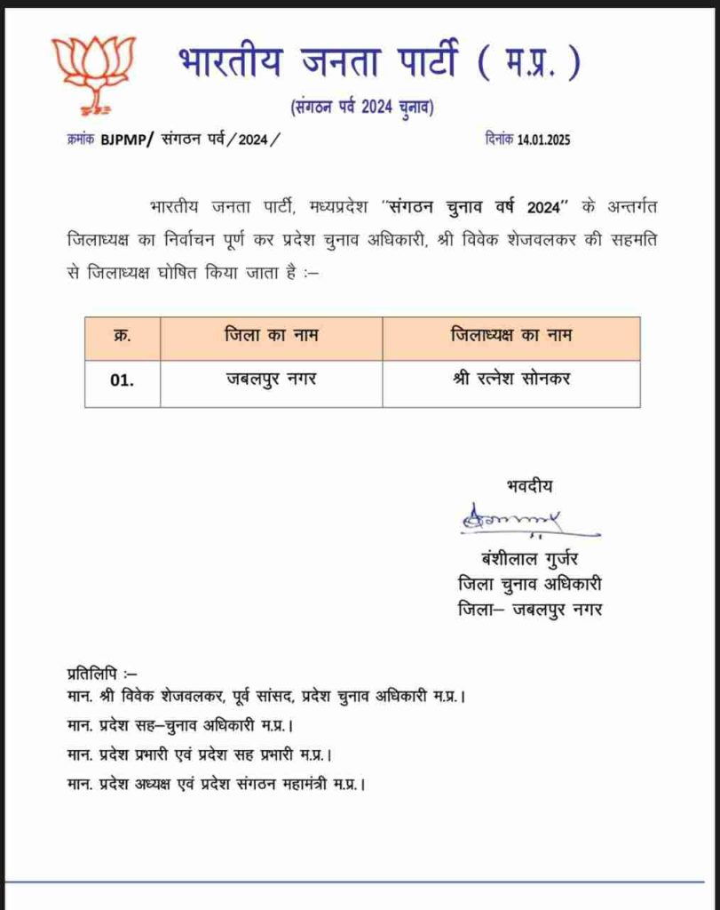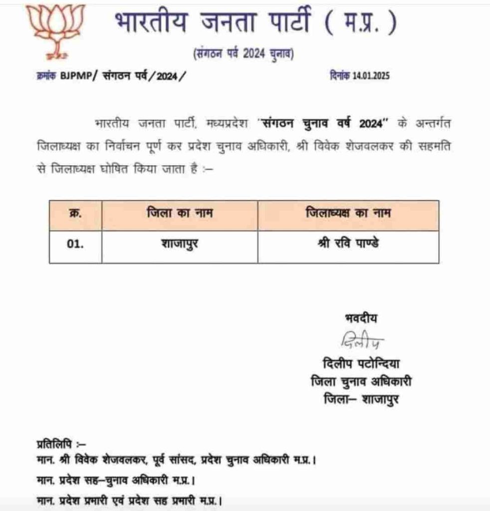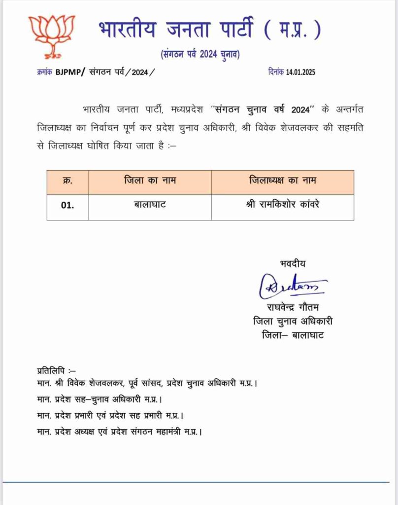 शब्बीर अहमद, भोपाल। MP BJP District President List released: मध्य प्रदेश भाजपा ने आज तीसरे दिन जिला अध्यक्षों की नई लिस्ट जारी की है। शाजापुर, डिंडोरी, ग्वालियर, सागर, दमोह, बालाघाट समेत कई जिलों में नेताओं को जिम्मेदारी दी गई है। शाजापुर से रवि पाण्डे, बालाघाट से रामकिशोर कांवरे, जबलपुर से रत्नेश सोनकर को जिम्मेदारी मिली है।