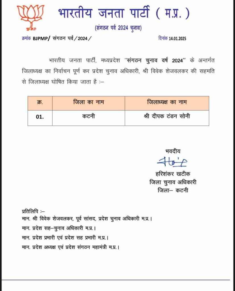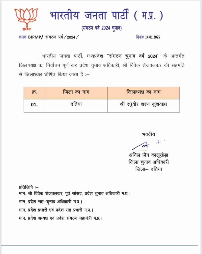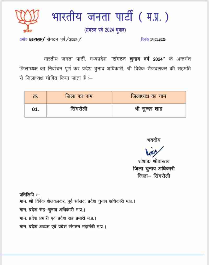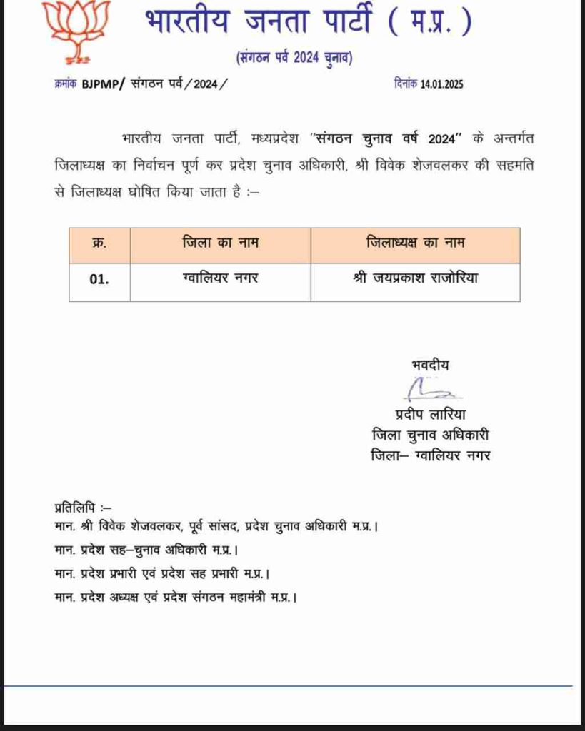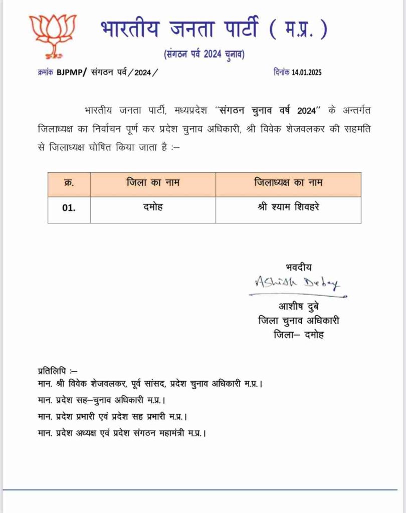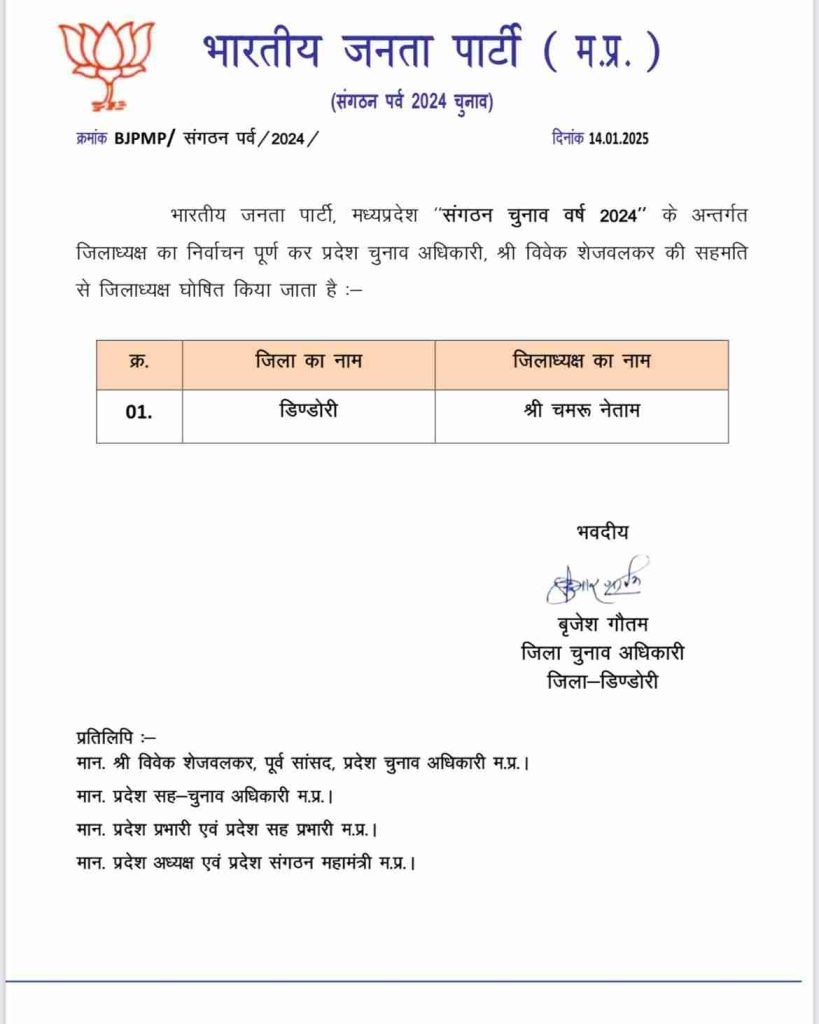 इसी कड़ी में डिंडोरी से चमरू नेताम, कटनी से दीपक टंडन सोनी, ग्वालियर नगर से जय प्रकाश राजोरिया और सागर से श्याम तिवारी की नियुक्ति की गई है। वहीं, दमोह से श्याम शिवहरे, दतिया से रघुवीर शरण कुशवाहा, अनूपपुर से हीरा सिंह श्याम, सागर ग्रामीण से रानी पटेल कुशवाहा और सिंगरौली से सुंदर शाह जिला अध्यक्ष बनाए गए हैं।