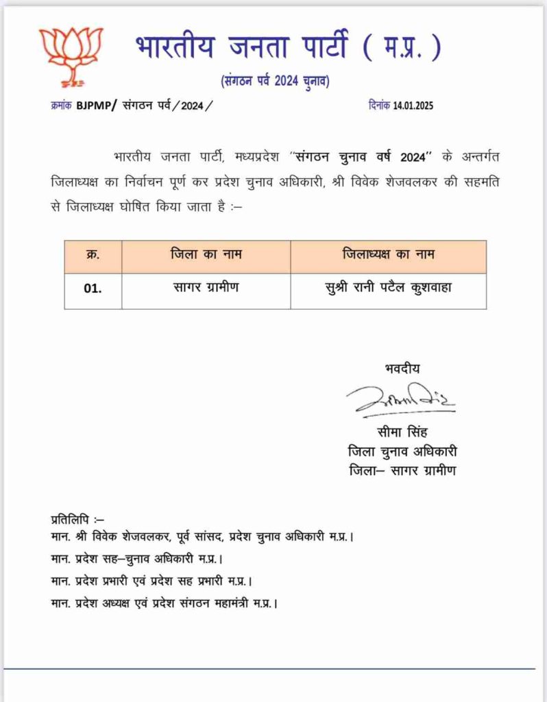 एमपी बीजेपी ने अब तक दो महिला जिला अध्यक्ष की नियुक्ति की है। सोमवार की सूची में नीमच से वंदना खंडेलवाल को पहली महिला जिला अध्यक्ष बनाया गया था। वहीं आज सागर ग्रामीण से रानी पटेल कुशवाहा दूसरी महिला जिला अध्यक्ष बनी हैं।