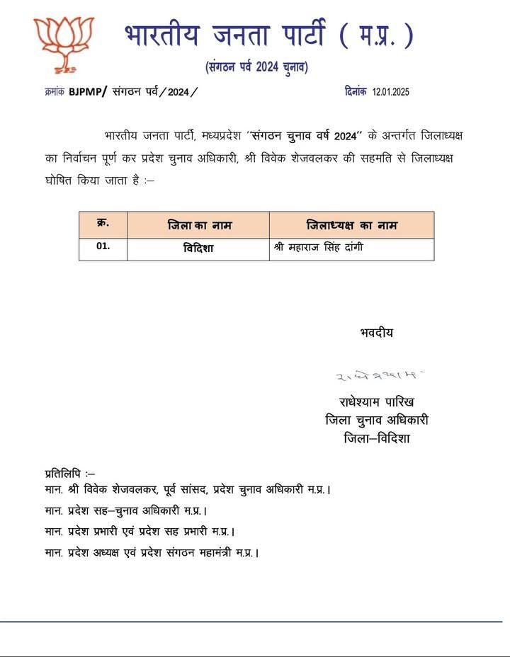 संदीप शर्मा, विदिशा। मध्य प्रदेश में भाजपा जिला अध्यक्षों (MP BJP Jila Adhyaksh) की नियुक्ति का सिलसिला शुरू हो गया है। मुख्यमंत्री डॉ. मोहन यादव (CM Dr. Mohan Yadav) के गृह नगर उज्जैन (Ujjain) के बाद विदिशा में नए अध्यक्ष (Vidisha BJP District President) का ऐलान कर दिया गया है। केंद्रीय कृषि मंत्री शिवराज सिंह चौहान (Shivraj SIngh Chouhan) के करीबी महाराज सिंह दांगी (Maharaj Singh Dangi) विदिशा के भारतीय जनता पार्टी के नए जिला अध्यक्ष बनाए गए हैं।