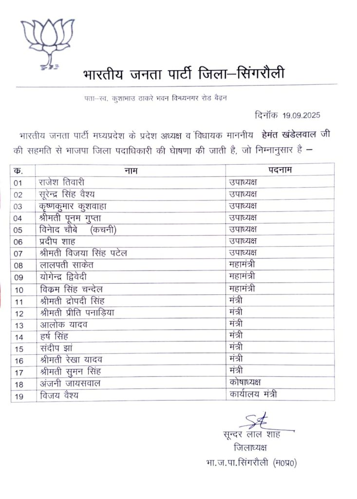 बीजेपी ने सिंगरौली की जिला कार्यकारिणी का ऐलान किया है। भाजपा प्रदेश अध्यक्ष हेमंत खंडेलवाल की सहमति के बाद इस सूची को जारी किया गया है। इस लिस्ट में 19 कार्यकर्ताओं के नाम शामिल हैं। राजेश तिवारी, सुरेंद्र सिंह वैश्य, कृष्ण कुमार कुशवाहा, पूनम गुप्ता, विनोद चौबे, प्रदीप शाह और विजया सिंह पटेल को उपाध्यक्ष बनाया गया हैं।