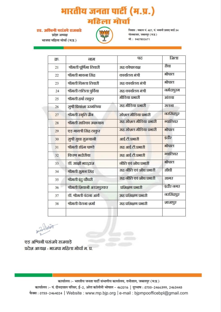 राकेश चतुर्वेदी, भोपाल। BJP Mahila Morcha Executive Committee Announced: मध्य प्रदेश भाजपा ने नवरात्रि पर महिला शक्ति को बड़ी जिम्मेदारी दी है। पार्टी ने प्रदेश की महिला मोर्चा की कार्यकारिणी घोषित कर दी है। 38 सदस्यीय कार्यकारिणी में 7 उपाध्यक्ष और तीन महामंत्री भी बनाई गई हैं।