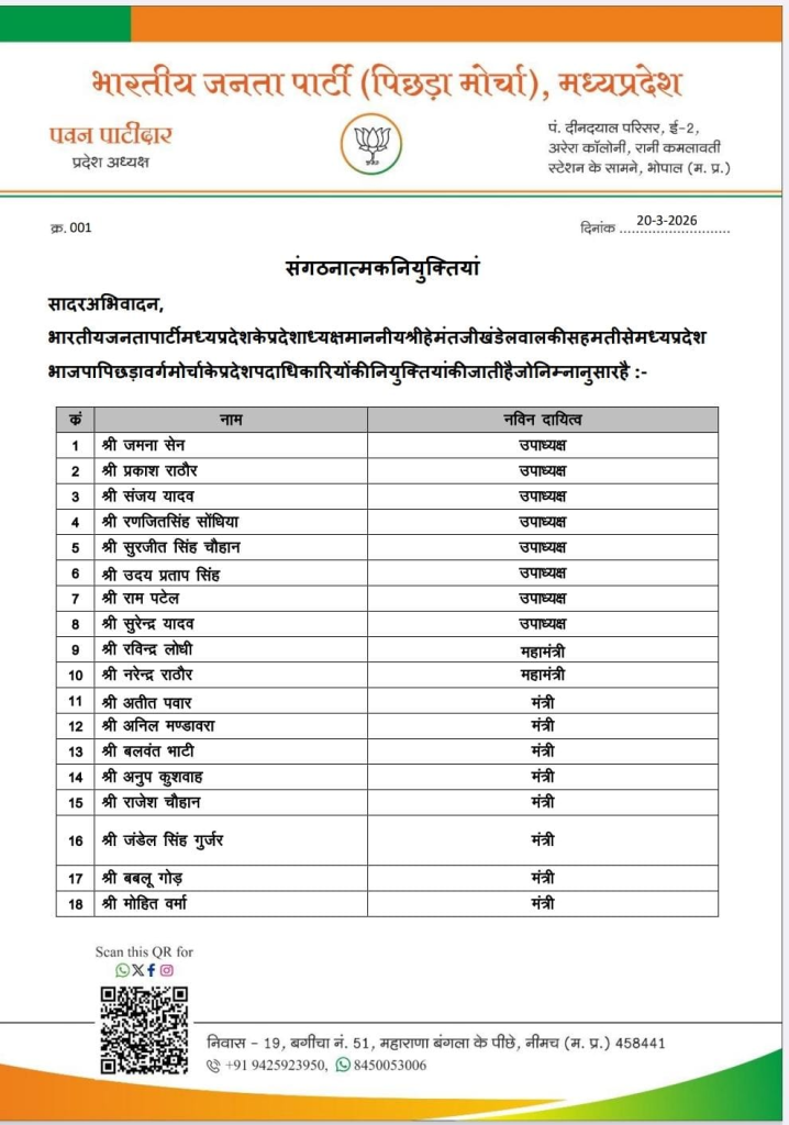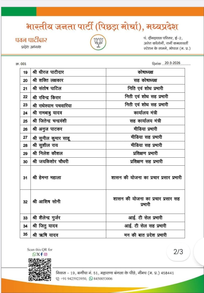 भाजपा ने पिछड़ा वर्ग मोर्चा के प्रदेश पदाधिकारियों की भी घोषणा कर दी है। इस कार्यकारिणी में 36 सदस्यों को जिम्मेदारी दी गई है।