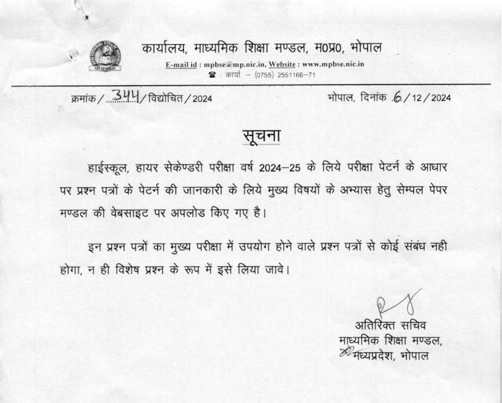 माशिमं ने एक सूचना पत्र जारी कि है। जिसमें लिखा- “हाईस्कूल, हायर सेकेंडरी परीक्षा वर्ष 2024-25 के लिए परीक्षा पैटर्न के आधार पर प्रश्न पत्रों के पैटर्न की जानकारी के लिए मुख्य विषयों के अभ्यास के लिए सैंपल पेपर मंडल की वेबसाइट पर अवपलोड किए गए हैं।” इसमें अंक योजना के साथ-साथ हर प्रश्न के पैटर्न की जानकारी दी गई है।