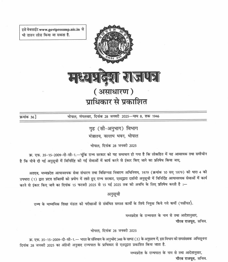 शब्बीर अहमद, भोपाल। मध्य प्रदेश में शिक्षा विभाग से जुड़ी बड़ी खबर सामने आई है। आगामी बोर्ड परीक्षाओं को देखते हुए राज्य सरकार ने बड़ा फैसला लिया है। प्रदेश में एसेंशियल सर्विसेज मैनेजमेंट एक्ट यानि एस्मा लागू कर दिया गया है। इसके अंतर्गत विभाग में कर्मचारियों, अधिकारियों, शिक्षकों के अवकाशों पर प्रतिबंध लगा दिया गया है। खासतौर पर शिक्षकों को तो किसी भी हाल में छुट्टी नहीं दी जा रही।
