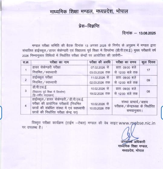 शब्बीर अहमद, भोपाल। मध्य प्रदेश में बोर्ड परीक्षाओं का टाइम टेबल जारी हो गया है। माध्यमिक शिक्षा मंडल ने 6 महीने पहले ही समय सारणी घोषित कर दी है। 12वीं बोर्ड की परीक्षा 7 फरवरी से शुरू होगी। वहीं 10वीं बोर्ड की परीक्षा 11 फरवरी से शुरू होगी। दोनों कक्षाओं का पहला पेपर हिंदी विषय का होगा।