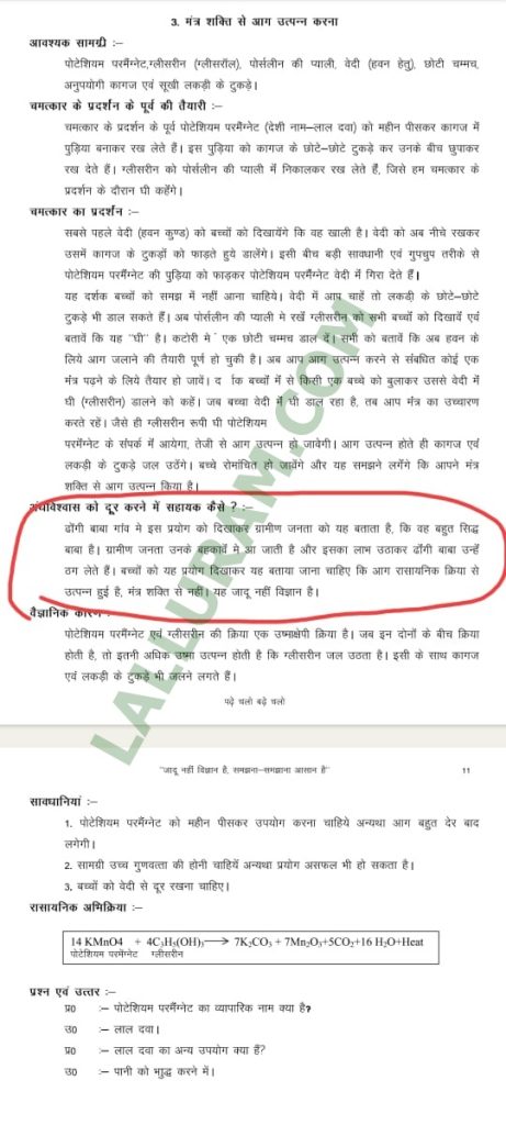 शिखिल ब्यौहार, भोपाल। मध्य प्रदेश बोर्ड के पाठ्यक्रम में सनातन के अपमान का मामला सामने आया है। 09वीं कक्षा से 12वीं के केमिस्ट्री सब्जेक्ट के पाठ्यक्रम में बाबा, साधु, संतों, महात्माओं को ढोंगी बताया गया है। जागरूकता के पाठ्यक्रम में लिखा गया है, “ढोंगी बाबा गांव में इस प्रयोग को दिखाकर ग्रामीण जनता को यह बताता है कि वह बहुत सिद्ध बाबा है। ग्रामीण जनता उनके बहकावे मे आ जाती है और इसका लाभ उठाकर ढोंगी बाबा उन्हें ठग लेते हैं। बच्चों को यह प्रयोग दिखाकर यह बताया जाना चाहिए कि आग रासायनिक क्रिया से उत्पन्न हुई है, मंत्र शक्ति से नहीं।”