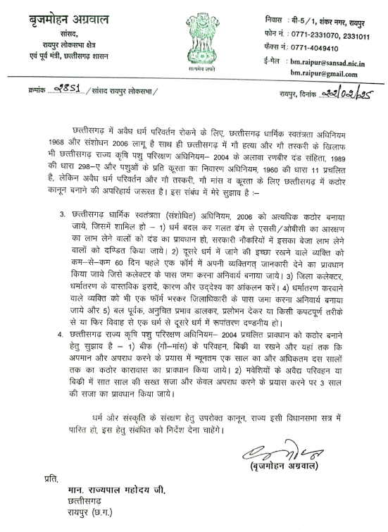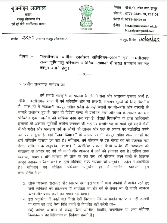 नितिन नामदेव, रायपुर. सांसद बृजमोहन अग्रवाल ने राज्य में बढ़ते धर्म परिवर्तन, लव जिहाद और गौ हत्या के मामलों पर गंभीर चिंता जताते हुए राज्यपाल और मुख्यमंत्री को पत्र लिखकर सख्त कानून बनाने की अपील की है.