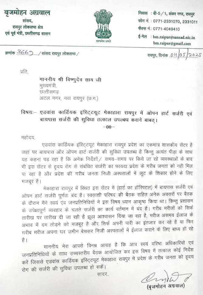 सांसद अग्रवाल ने मुख्यमंत्री से आग्रह किया है कि इस विषय पर वरिष्ठ अधिकारियों एवं जनप्रतिनिधियों के साथ उच्चस्तरीय बैठक आयोजित कर अविलंब निर्णय लिया जाए, ताकि मेकाहारा रायपुर स्थित कार्डियक इंस्टिट्यूट में गरीब जनता को आवश्यक सर्जरी सुविधा उपलब्ध कराई जा सके और उन्हें जीवनदान मिल सके.