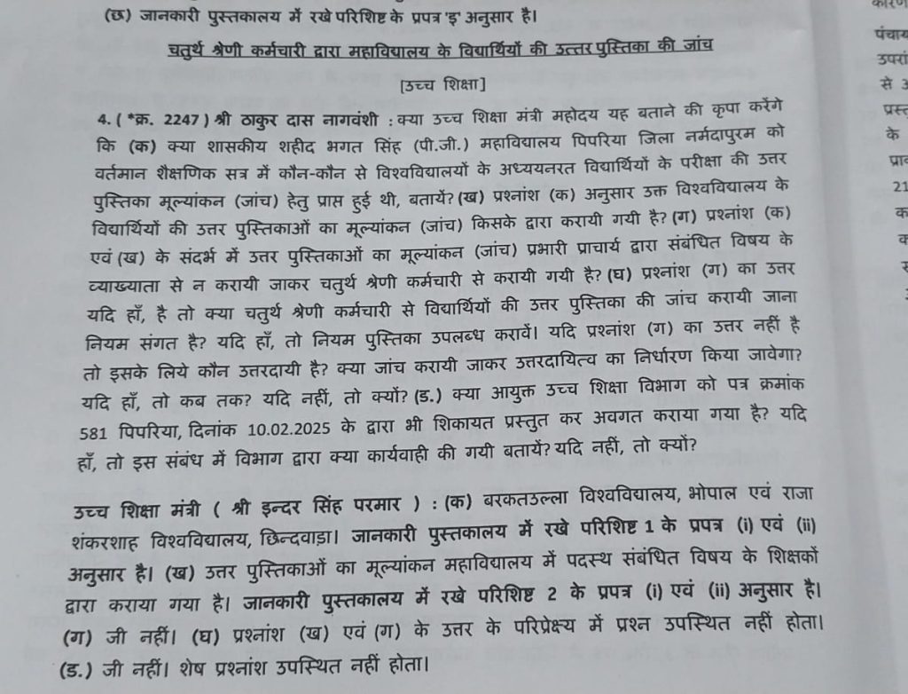राकेश चतुर्वेदी, भोपाल। मध्यप्रदेश विधानसभा के बजट सत्र में आज प्रश्नकाल के दौरान भोज विश्वविद्यालय का मामला गूंजा। प्रश्नकाल में कांग्रेस विधायक नारायण सिंह पट्टा ने भोज विश्वविद्यालय में 2013-14 में कर्मचारियों की नियुक्ति का मामला सदन में उठाया। विधायक का आरोप है कि नियम विरुद्ध कई कर्मचारियों नियुक्ति की गई। इसी तरह बीजेपी विधायक ठाकुर दास नागवंशी ने पिपरिया के शासकीय शहीद भगत सिंह पीजी कॉलेज में विद्यार्थियों की कॉपियों का मूल्यांकन चतुर्थ श्रेणी के कर्मचारी द्वारा कराने का आरोप लगाया। कहा प्रभारी प्राचार्य ने चतुर्थ श्रेणी कर्मचारी से कॉपी जंचवाई है। उच्च शिक्षा मंत्री ने सदन में प्रभारी प्राचार्य के ट्रांसफर का आश्वासन दिया।