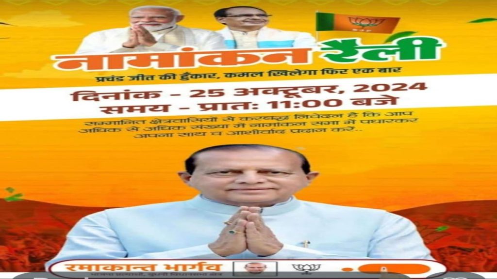 बता दें कि आज शुक्रवार को भारतीय जनता पार्टी के प्रत्याशी रमाकांत भार्गव के द्वारा कार्यकर्ताओं के साथ शक्ति प्रदर्शन करते हुए अपना नामांकन पत्र जमा करेंगे। नामांकन जमा करने के लिए सोशल मीडिया पर भाजपा के द्वारा एक पोस्टर जारी किया गया है। इस पोस्टर से वर्तमान मुख्यमंत्री डॉ मोहन यादव एवं भाजपा प्रदेशाध्यक्ष वीडी शर्मा के फोटो गायब है। सोशल मीडिया पर वायरल इस पोस्टर पर भी अब सवाल खड़े हो रहे है। गुरूवार को जारी सोशल मीडिया पोस्टर में मुख्यमंत्री और भाजपा प्रदेशाध्यक्ष का फोटो गायब होना चर्चा का विषय बना हुआ है। इसी के साथ सांसद गायब वाले पोस्टर भी खूब वायरल हो रहे थे।