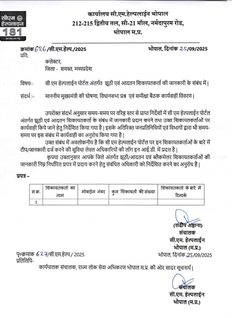आदेश के अनुसार, सीएम हेल्पलाइन पोर्टल पर लेवल अधिकारियों की लॉगिन आईडी में ऐसी शिकायतकर्ताओं के बारे में टीप या जानकारी दर्ज करने की सुविधा उपलब्ध है। सभी कलेक्टर्स को निर्देश दिए गए हैं कि अपने जिले में झूठी, आदतन और ब्लैकमेलर शिकायतकर्ताओं की डिटेल्स निर्धारित प्रपत्र में जमा करें। इससे न केवल हेल्पलाइन की विश्वसनीयता बढ़ेगी, बल्कि असली जरूरतमंदों को बेहतर सेवा मिल सकेगी।