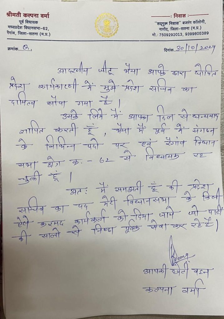 शब्बीर अहमद, भोपाल। मध्यप्रदेश कांग्रेस कार्यकारिणी को लेकर बवाल जारी है। अब रैगांव की पूर्व विधायक कल्पना वर्मा ने सचिव पद की जिम्मेदारी लेने से इनकार कर दिया है। पूर्व विधायक कल्पना वर्मा ने पीसीसी चीफ जीतू पटवारी को पत्र लिखा है। जिसमें उन्होंने कहा कि सचिव पद की जिम्मेदारी किसी और को दी जाए।
