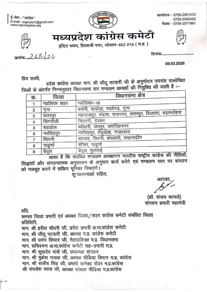 शब्बीर अहमद, भोपाल। मध्य प्रदेश कांग्रेस ने कई जिलों में संगठनात्मक नियुक्तियां की है। जिसमें 9 जिलो में विधानसभावार मंडल अध्यक्षों और 26 नगर अध्यक्षों का ऐलान किया गया है। प्रदेश कांग्रेस अध्यक्ष जीतू पटवारी के निर्देश पर नामों की घोषणा की गई है। वन एवं पर्यावरण प्रकोष्ठ के जिला अध्यक्षों की नियुक्ति की गई है।