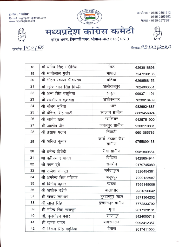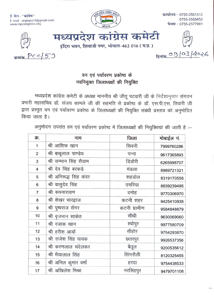 जीतू पटवारी के निर्देशानुसार वन एवं पर्यावरण प्रकोष्ठ के जिला अध्यक्षों की नियुक्ति की गई है।