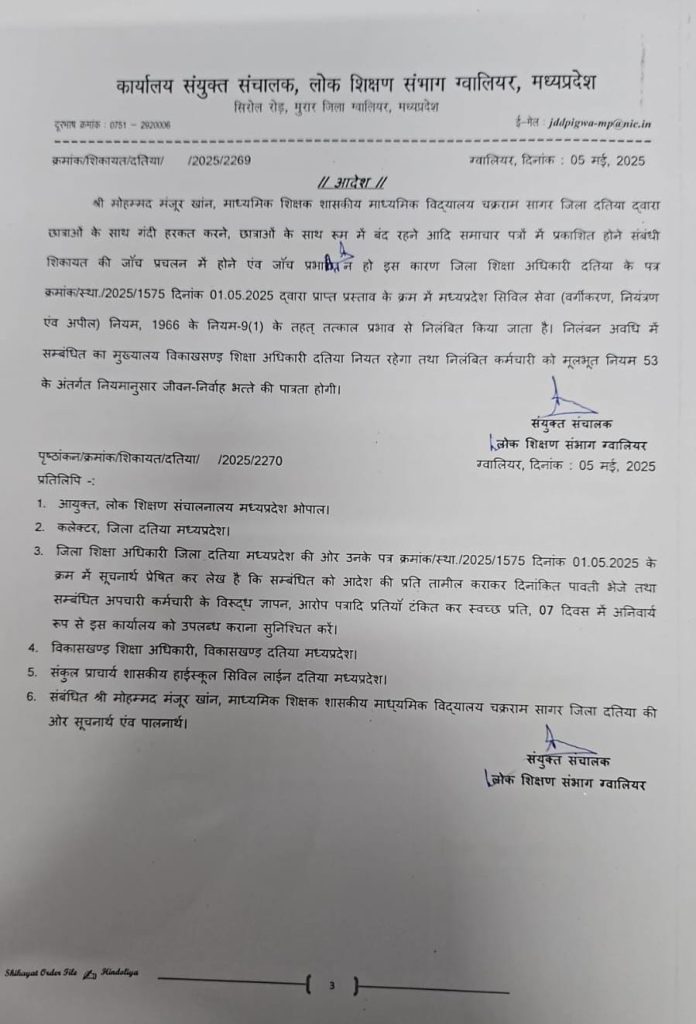 रवि रायकवार, दतिया। मध्य प्रदेश के दतिया जिले के सरकारी शिक्षक मंजूर खान को निलंबित कर दिया गया है। दरअसल, छात्राओं ने टीचर मंजूर पर अश्लील हरकत करने के आरोप लगाए थे। जांच में आरोप सही पाए गए। जिसके बाद संयुक्त संचालक ग्वालियर ने उन्हें सस्पेंड कर दिया।