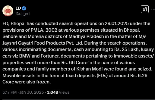 ईडी ने छापे की जानकारी सोशल मीडिया प्लेटफॉर्म एक्स पर दी है। जांच एजेंसी ने बताया, “भोपाल ने मेसर्स जयश्री गायत्री फूड प्रोडक्ट्स प्राइवेट लिमिटेड के मामले में मध्य प्रदेश के भोपाल, सीहोर और मुरैना जिलों में स्थित विभिन्न परिसरों में पीएमएलए, 2002 के प्रावधानों के तहत 29.01.2025 को तलाशी अभियान चलाया। तलाशी अभियान के दौरान, विभिन्न आपत्तिजनक दस्तावेज, 25 लाख रुपये की नकदी, बीएमडब्ल्यू और फॉर्च्यूनर जैसी लग्जरी कारें, किशन मोदी की विभिन्न कंपनियों और परिवार के सदस्यों के नाम पर 66 करोड़ रुपये से अधिक की अचल संपत्ति/संपत्तियों से संबंधित दस्तावेज पाए गए और उन्हें जब्त कर लिया गया। लगभग 6.26 करोड़ रुपये की सावधि जमा (एफडी) के रूप में चल संपत्ति भी जब्त कर ली गई।”