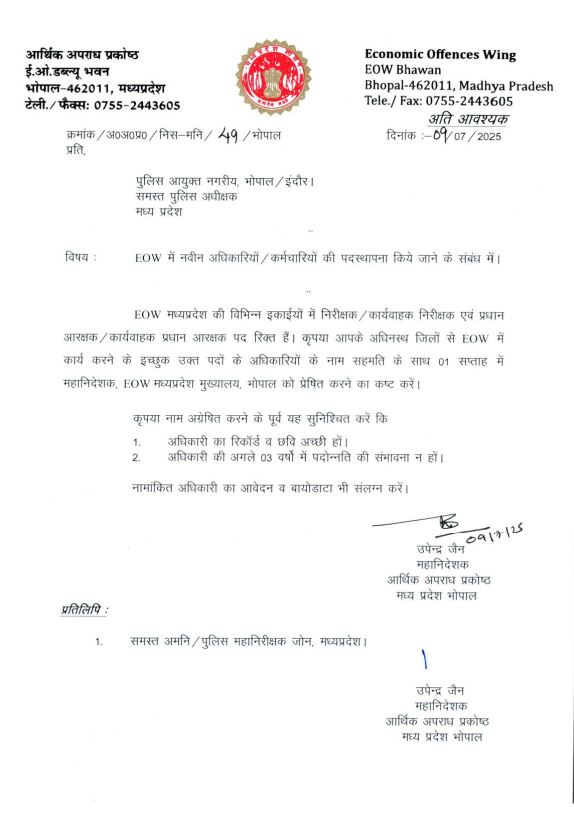 शिखिल ब्यौहार, भोपाल। मध्य प्रदेश में ईओडब्ल्यू को अधिकारी-कर्मचारी नहीं मिल रहे है। दरअसल, ईओडब्ल्यू मुख्यालय ने एक आदेश निकाला है। जिसमें इच्छुक अधिकारियों और कर्मचारियों से आवेदन मांगा गया। आदेश में लिखा है कि सभी जिलों में रिक्त पद के लिए आवश्यकता है।