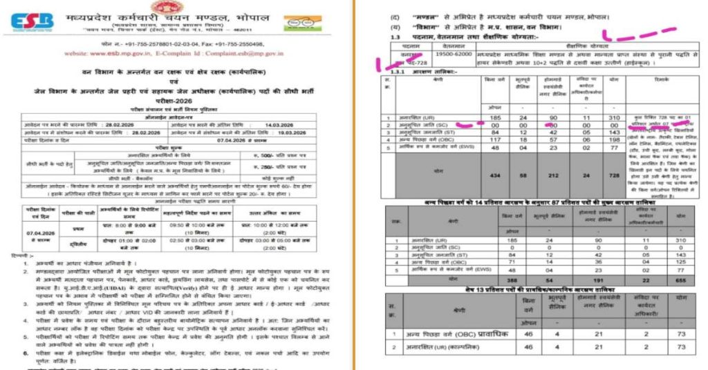 वनरक्षक के लिए 728 पदों में अनारक्षित वर्ग के लिए 185, एसटी के लिए 84, ओबीसी के लिए 117 और ईडब्ल्यूएस (EWS) के लिए 48 पद आरक्षित है। एससी (SC) वर्ग के लिए एक भी पद आरक्षित नहीं किया गया है। ESB के विज्ञापन में आरक्षण रोस्टर का पालन नहीं है।