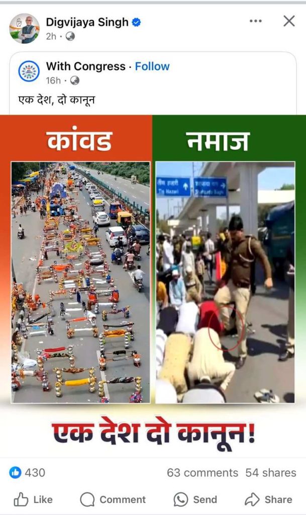 राज्यसभा सांसद दिग्विजय सिंह व एमपी के पूर्व सीएम दिग्विजय सिंह ने अपने फेसबुक पेज पर एक पोस्ट किया है। उन्होंने दो तस्वीर शेयर किया है। जिसमें कांवड़ यात्रा को सड़क पर दिखाया गया है, दूसरी तस्वीर में नमाज अदा करते हुए लोग नजर आ रहे हैं। वहीं दिग्गी ने सवाल उठाते हुए लिखा कि ‘एक देश, दो कानून?’।