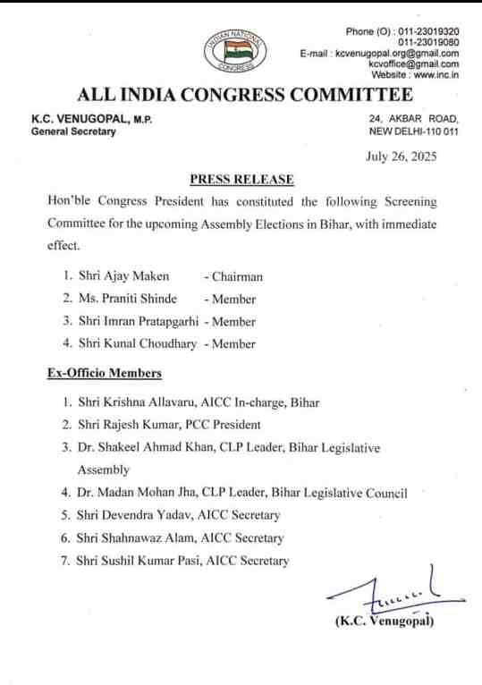 दरअसल, कांग्रेस राष्ट्रीय महासचिव के सी वेणुगोपाल ने बिहार विधानसभा चुनाव (Bihar Assembly Elections) के लिए स्क्रीनिंग कमेटी के गठन का आदेश जारी किया है। अजय माकन इसक अमेठी के चेयरमैन बनाए गए हैं। वहीं प्रणीति शिंदे, इमरान प्रतापगढ़ी और कुणाल चौधरी इसके सदस्य बनाए गए हैं। बता दें कि कुणाल कांग्रेस के राष्ट्रीय सचिव हैं।