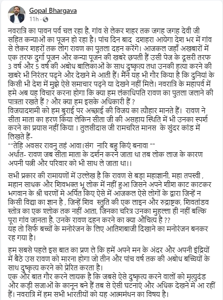 गोपाल भार्गव ने आगे अपनी पोस्ट में लिखा, ‘यह तो सिर्फ बच्चों के मनोरंजन के लिए आतिशबाजी दिखाने का मनोरंजन बनकर रह गया है। हम सबसे पहले इस बात का प्रण ले कि हमें अपने मन के अंदर और अपनी इंद्रियों में बैठे उस रावण को मारना होगा जो तीन और पांच वर्ष तक की अबोध बच्चियों के साथ दुष्कृत्य करने को प्रेरित करता है। एक और बात गौर करने लायक है कि जबसे ऐसे दुष्कृत्य करने वालों को मृत्युदंड और कड़ी सजाओं के कानून बने हैं तब से ऐसी घटनाएं और अधिक देखने मे आ रहीं हैं। नवरात्रि में हम सभी भारतीयों को यह आत्ममंथन का विषय है।’