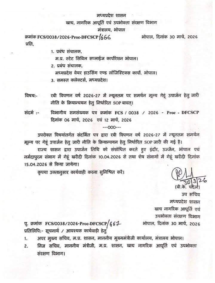 शिखिल ब्यौहार, भोपाल। मध्य प्रदेश के किसानों से जुड़ी बड़ी खबर है। प्रदेश सरकार ने गेहूं खरीदी की तारीख आगे बढ़ा दी हैं। भोपाल, इंदौर, उज्जैन और नर्मदापुरम संभाग में 1 अप्रैल की जगह अब 10 अप्रैल से खरीदी होगी। बाकी के संभगों में 15 अप्रैल से गेहूं खरीदा जाएगा। इस संबंध में खाद्य नागरिक आपूर्ति एवं उपभोक्ता संरक्षण मंत्रालय ने आदेश जारी कर दिया है।