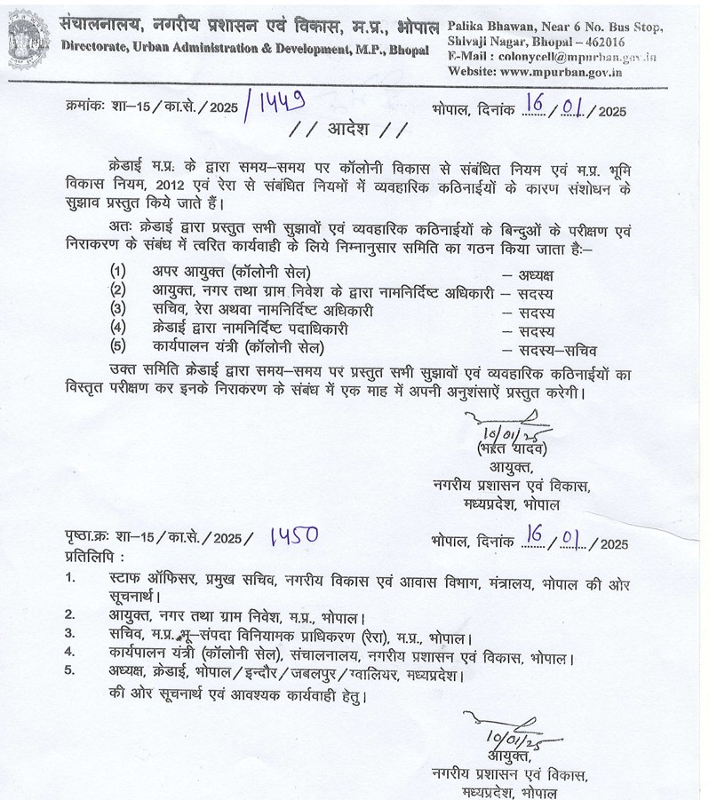 शिखिल ब्यौहार, भोपाल। मध्यप्रदेश शासन ने रियल एस्टेट क्षेत्र की लंबित समस्याओं के समाधान और क्रेडाई भोपाल द्वारा प्रस्तुत व्यवहारिक कठिनाइयों के परीक्षण हेतु एक उच्चस्तरीय समिति का गठन किया है। यह समिति नगरीय प्रशासन एवं विकास विभाग द्वारा जारी आदेश के अनुसार विभिन्न मुद्दों का गहन अध्ययन कर त्वरित निराकरण सुनिश्चित करेगी।