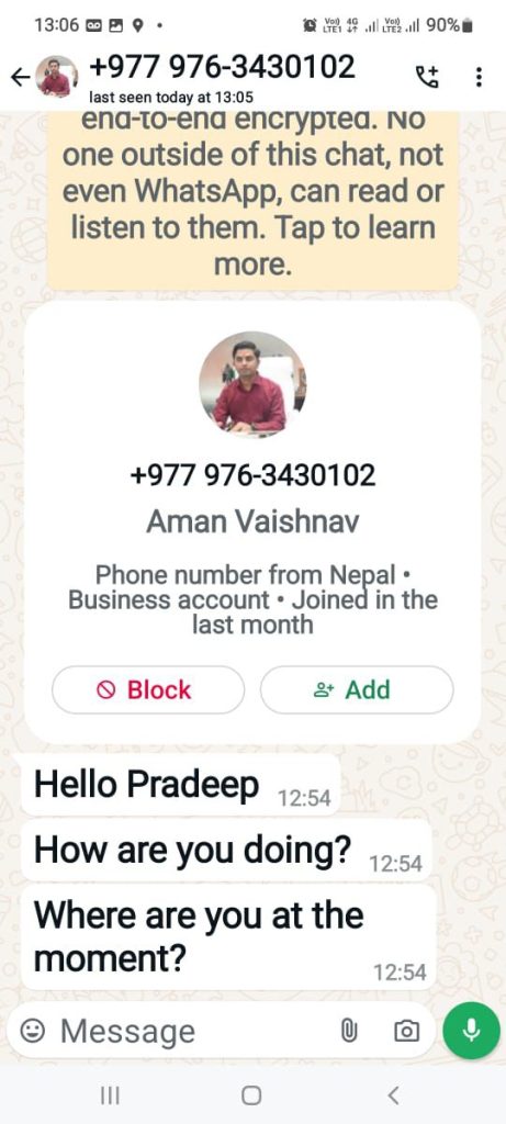 दरअसल, ग्वालियर निगम आयुक्त अमन वैष्णव के फोटो का उपयोग कर नेपाल और श्रीलंका के नंबर के जरिए व्हाट्सएप अकाउंट बनाए गए। इन व्हाट्सएप अकाउंट के जरिए ग्वालियर नगर निगम में ही पदस्थ उपायुक्त सहित अन्य अधिकारियों को व्हाट्सएप पर मैसेज भेजे गए। लेकिन नंबर को देखकर उपायुक्त सहित अन्य अधिकारियों को शंका हुई और उन्होंने इस पूरे मामले की जानकारी नगर निगम आयुक्त अमन वैष्णव को दी।