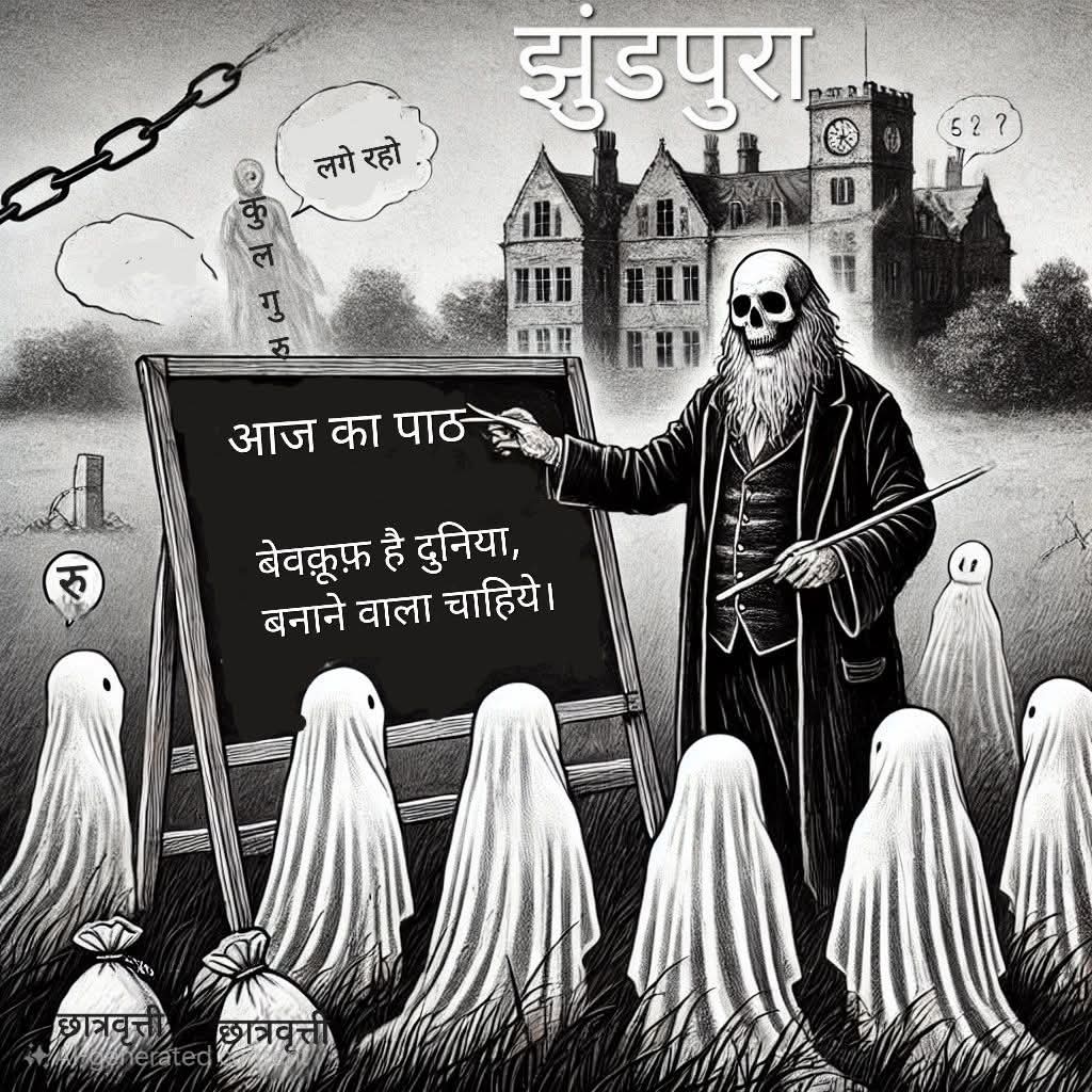 कर्ण मिश्रा, ग्वालियर। मध्य प्रदेश में ग्वालियर के जीवाजी विश्वविद्यालय द्वारा फर्जी कॉलेज को मान्यता देने के मामले में लगातार आंदोलन देखने को मिला रहा है। इसी बीच एक पोस्टर चर्चाओं में है। पोस्टर में एक ‘भूत प्रोफेसर’ कुछ ‘भूतिया छात्रों’ को पढ़ाते हुए नजर आ रहा है। यह पोस्टर बेनर जीवाजी विश्वविद्यालय के एडमिनिस्ट्रेशन बिल्डिंग के बाहर लगाया गया है।