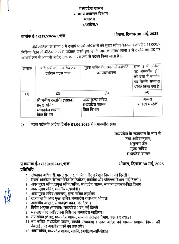 सुधीर दंडोतिया, भोपाल। IAS PROMOTION: मध्य प्रदेश सरकार (MP Government) ने 1994 बैच के आईएएस मनीष रस्तोगी का प्रमोशन (IAS Manish Rastogi Promotion) कर दिया है। जिसके बाद उन्हें वित्त विभाग (Finance Department) का अपर मुख्य सचिव (Additional Chief Secretary) बनाया गया है। इसे लेकर सामान्य प्रशासन विभाग (General Administration Department) की ओर से आदेश जारी कर दिया है।