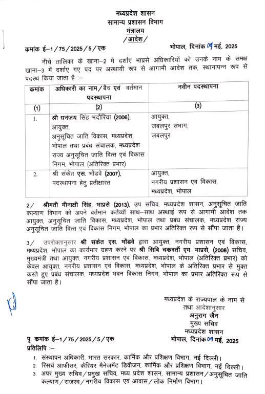भारतीय प्रशासनिक सेवा में 2006 बैच के IAS अधिकारी धनंजय सिंह भदोरिया को जबलपुर संभाग का आयुक्त बनाया गया है। भदोरिया वर्तमान में अनुसूचित जाति विकास आयुक्त हैं। IAS अधिकारी संकेत भोंडवे को आयुक्त नगरीय प्रशासन एवं विकास विभाग पदस्थ किया गया है। सीवी चक्रवर्ती सचिव मुख्यमंत्री, आयुक्त नगरी प्रशासन एवं विकास विभाग के अतिरिक्त प्रभार से मुक्त होंगे।