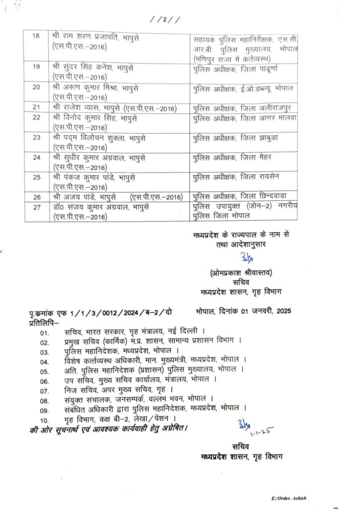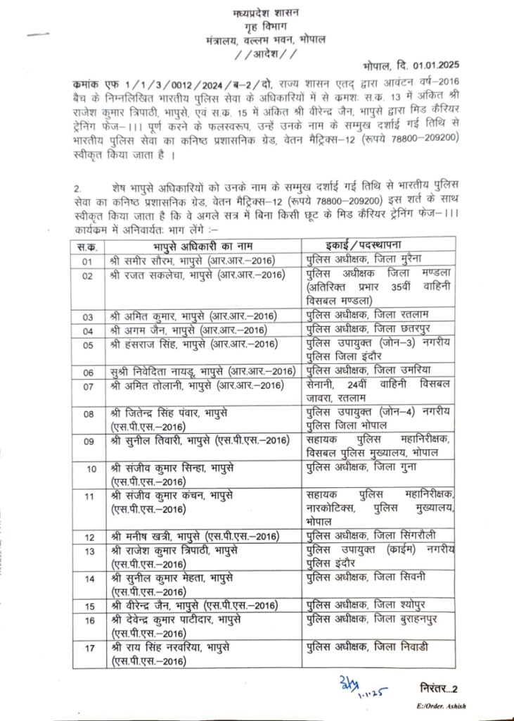 शब्बीर अहमद, भोपाल। मध्य प्रदेश की डॉ मोहन यादव सरकार ने नए साल के पहले दिन आईपीएस अधिकारियों को बड़ा तोहफा दिया है। प्रदेश के 27 IPS अफसरों का वेतन मान बढ़ाया गया। इन आईपीएस को भारतीय पुलिस सेवा का कनिष्ठ प्रशासनिक ग्रेड स्वीकृत किया गया है। कई जिलों के पुलिस अधीक्षकों को कनिष्ठ प्रशासनिक ग्रेड स्वीकृत हुआ। इस संबंध में राज्य शासन ने आदेश जारी कर दिए हैं।