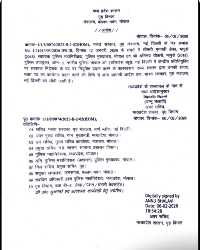 शिखिल ब्यौहार, भोपाल। साल 2018 कैडर के आईपीएस अधिकारी अभिनव चौकसे और मृगाखी डेका को केंद्रीय प्रतिनियुक्ति पर भेजा गया है। मध्य प्रदेश ने केंद्रीय गृह मंत्रालय को दोनों की सेवाएं सौंप दी है। इस संबंध में आदेश भी जारी हो गया है।