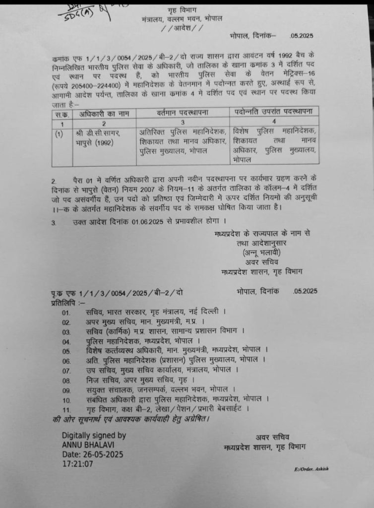 सुधीर दंडोतिया, भोपाल। IPS PROMOTION: भारतीय पुलिस सेवा अधिकारी डी सी सागर को पदोन्नत किया गया है। उन्हें विशेष पुलिस महानिदेशक नियुक्त किया गया है। गृह विभाग की ओर से इसे लेकर आदेश जारी कर दिया है।