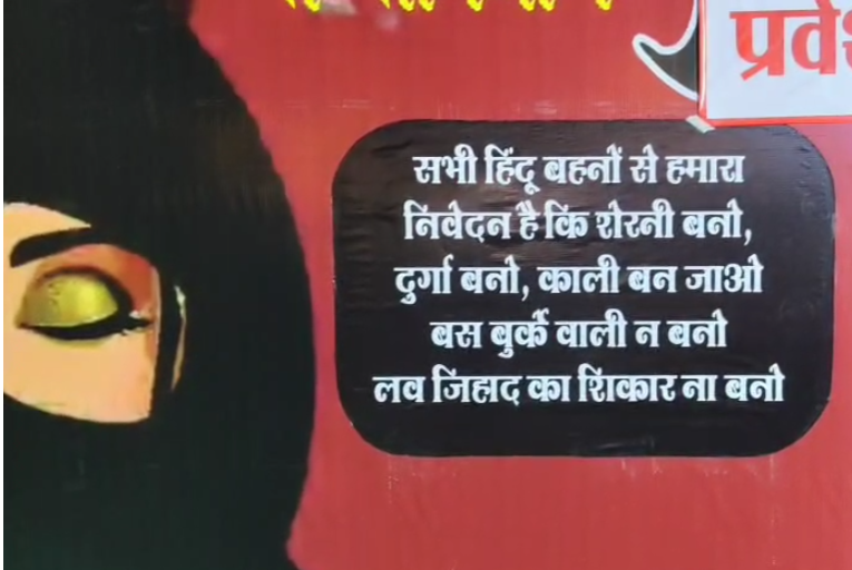 वहीं पंडाल में थोड़ा अंदर जाते ही जगह-जगह अख़बारों या अन्य माध्यम से प्रकाशित लव जिहाद की ख़बरों की कटिंग चिपकाई गई है।