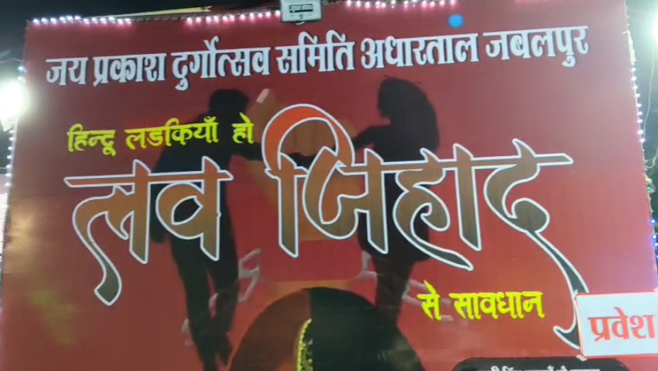 दरअसल, अधारताल इलाके के जयप्रकाश नगर में लव जिहाद की थीम पर दुर्गा पंडाल बना है। गेट में एंट्री से पहले अलग-अलग संदेश लव जिहाद को लेकर दिए गए हैं। यहां एक संदेश लिखा गया – ‘सभी बहनों से हमारा निवेदन है कि शेरनी बनो, दुर्गा बनो, काली बन जाओ बस बुर्के वाली न बनो। लव जिहाद का शिकार न बनो।’