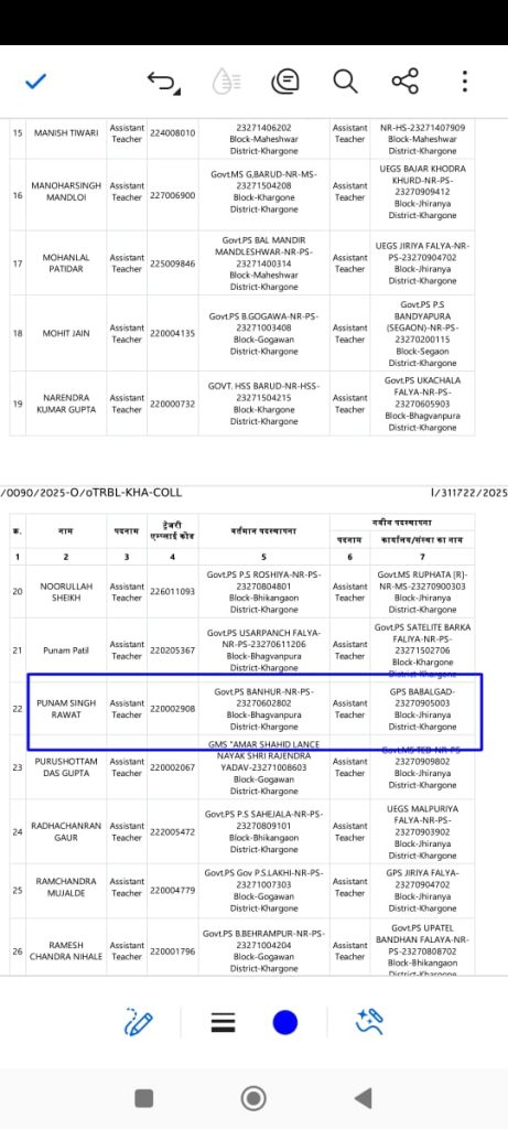 जानकारी के मुताबिक, भगवानपुरा ब्लॉक में प्राथमिक स्कूल शिक्षक पूनम सिंह रावत का ट्रांसफर झिरन्या ब्लॉक में किया गया। जबकि शिक्षक पूनम सिंह रावत 11 फरवरी 2025 को ही स्वर्ग सिधार चुके है। इतना ही नहीं निलंबित शिक्षक दिनेश पटेल का भी ट्रांसफर किया गया है। यह कारनामा सामने आने के बाद कई तरह के सवाल उठ रहे है। क्या अब स्कूलों में छात्रों को मृत शिक्षक पढ़ाएंगे ? इस कांड के बाद शिक्षा विभाग की जमकर किरकिरी हो रही है।