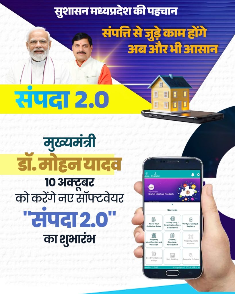 मुख्यमंत्री डॉ. मोहन यादव पंजीयन एवं मुद्रांक विभाग के सम्पदा 2.0 सॉफ्टवेयर का शुभारंभ करेंगे। संपत्ति पंजीकरण प्रक्रिया को डिजिटल बनाने की दिशा में राज्य शासन का यह एक महत्वपूर्ण कदम है। प्रदेश में रजिस्ट्री के नये नियम लागू किये गये है। इस उन्नत सॉफ्टवेयर का पायलेट प्रोजेक्ट का क्रियान्वयन गुना, हरदा, डिंडोरी और रतलाम जिलों में सफलतापूर्वक पूर्ण कर लिया गया है। आज इसे प्रदेश के सभी 55 जिलों में लागू किया जाएगा।
