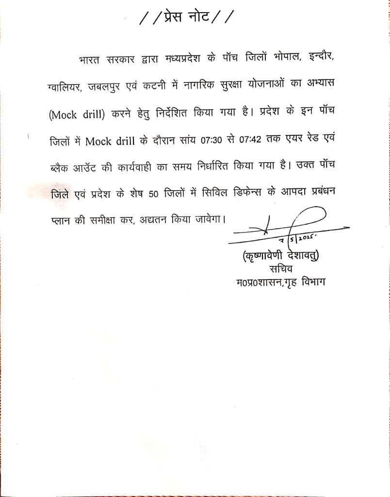 भोपाल। मध्य प्रदेश के 5 जिले भोपाल, ग्वालियर, इंदौर, जबलपुर और कटनी में आज मॉक ड्रिल है। गृह विभाग की ओर से इसे लेकर एक आदेश जारी किया गया है जिसके मुताबिक शाम साढ़े 7 बजे से 7 बजकर 42 मिनट तक सभी जिले अंधेरे में डूब जाएंगे। इस दौरान एयर सायरन बजाया जाएगा। इन पांचों जिलों और प्रदेश के बाकी 50 जिलों में सिविल डिफेन्स के आपदा प्रबंधन प्लान की समीक्षा कर अपडेट किया जाएगा।