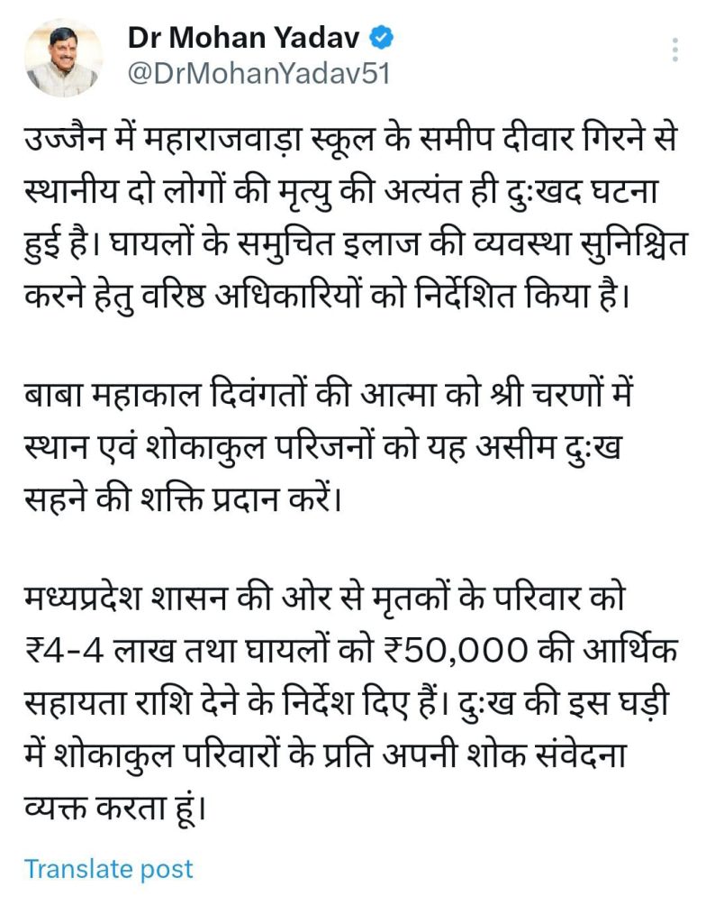 मुख्यमंत्री डॉ मोहन यादव ने X पर ट्वीट करते हुए लिखा कि उज्जैन में महाराजवाड़ा स्कूल के समीप दीवार गिरने से स्थानीय दो लोगों की मृत्यु की अत्यंत ही दुःखद घटना हुई है। घायलों के समुचित इलाज की व्यवस्था सुनिश्चित करने हेतु वरिष्ठ अधिकारियों को निर्देशित किया है।बाबा महाकाल दिवंगतों की आत्मा को श्री चरणों में स्थान एवं शोकाकुल परिजनों को यह असीम दुःख सहने की शक्ति प्रदान करें। मध्यप्रदेश शासन की ओर से मृतकों के परिवार को ₹4-4 लाख तथा घायलों को ₹50,000 की आर्थिक सहायता राशि देने के निर्देश दिए हैं। दुःख की इस घड़ी में शोकाकुल परिवारों के प्रति अपनी शोक संवेदना व्यक्त करता हूं।