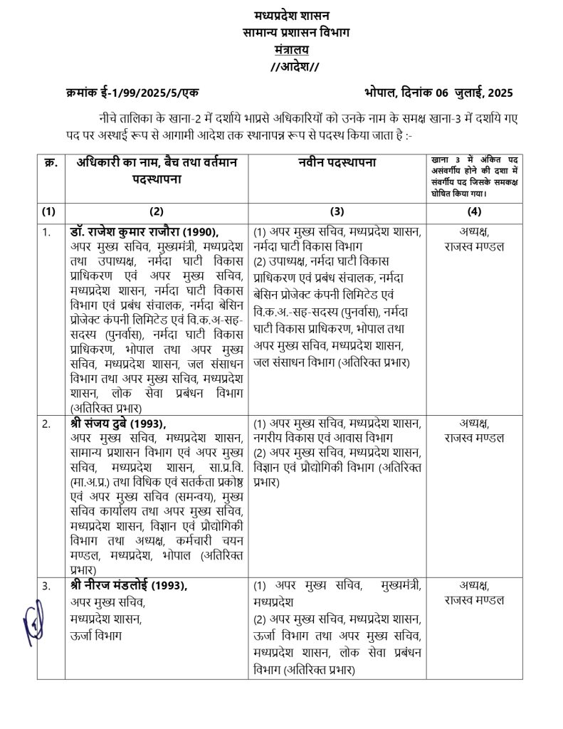 सुधीर दंडोतिया, भोपाल। IAS TRANSFER: मध्य प्रदेश में (Madhya Pradesh) आज आईएएस अफसरों का तबादला हुआ है। 9 अधिकारियों को इधर से उधर किया गया है। ऊर्जा विभाग के अपर मुख्य सचिव नीरज मंडलोई (Neeraj Mandloi) को बड़ी जिम्मेदारी दी गई है। उन्हें मुख्यमंत्री डॉ. मोहन यादव का अपर मुख्य सचिव नियुक्त किया गया है।