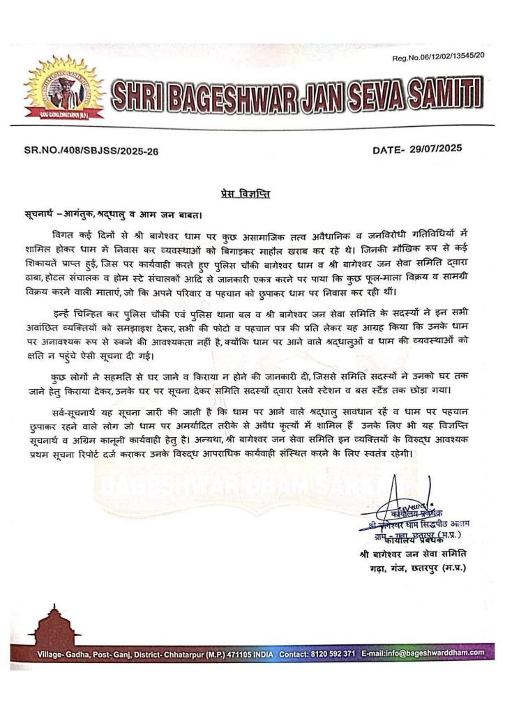 इधर प्रबंधन की ओर से 29 जुलाई को जारी विज्ञप्ति में कहा गया है कि- पहचान छुपा कर धाम में कुछ लोग अव्यवस्था फैला रहे थे। धाम की विज्ञप्ति में कुछ लोगों पर अवैध तरीके से बागेश्वर धाम में रहने का आरोप लगाया गया है। धाम में पहचान छुपा कर चोरी, चेन स्नेचिंग जैसे वारदात को भी अंजाम देने की बात कही है। विज्ञप्ति कुंज बिहारी, सेवक, बागेश्वर धाम के नाम से जारी की गई है।