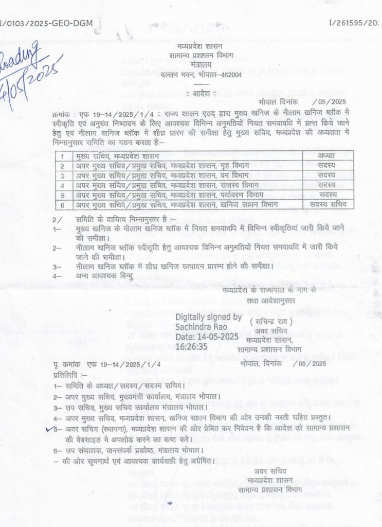 मध्यप्रदेश के सामान्य प्रशासन विभाग ने इस आशय का आदेश जारी कर दिया है। आदेश की प्रतिया सभी सदस्यों को भेजी गई है। जारी आदेश में अवर सचिव सचिंद्र राव सामान्य प्रशासन विभाग के हस्ताक्षर है। कमेटी नीलाम खनिज ब्लॉक में शीघ्र खनिज उत्पादन प्रारंभ होने की समीक्षा करेगी।