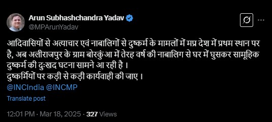 नाबालिग से दुष्कर्म की घटना के बाद कांग्रेस ने आरोपियों के खिलाफ कड़ी कार्रवाई की मांग की है। पूर्व केंद्रीय मंत्री अरुण यादव ने सोशल मीडिया प्लेटफार्म एक्स पर लिखा- “आदिवासियों से अत्याचार एवं नाबालिगों से दुष्कर्म के मामलों में मप्र देश में प्रथम स्थान पर है, अब अलीराजपुर के ग्राम बोरकुंआ में तेरह वर्ष की नाबालिग से घर में घुसकर सामूहिक दुष्कर्म की दुःखद घटना सामने आ रही है। दुष्कर्मियों पर कड़ी से कड़ी कार्यवाही की जाए।”