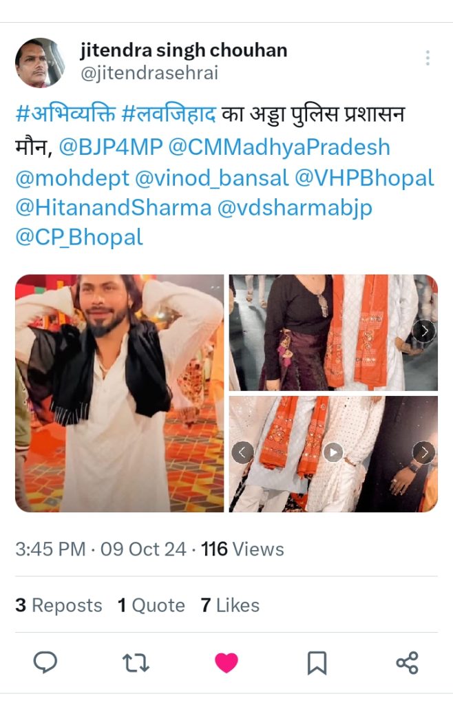 विश्व हिंदू परिषद (वीएचपी) के जितेंद्र सिंह चौहान ने इसकी शिकायत की है। उन्होंने कहा कि- गरबा में आने वाले लोगों के आईडी कार्ड नहीं जांचे जा रहे है जिससे गरबा में गैर हिंदू युवकों का प्रवेश हो रहा है। उन्होंने मामले को लेकर सोशल मीडिया एक्स (X) पोस्ट किया है। उन्होंने X पर लिखा- अभिव्यक्ति गरबा आयोजनकर्ता पर लव जिहाद को दे रहे बढ़ावा। उन्होंने बीजेपी एमपी और सीएम डॉ मोहन यादव को टैग भी किया है।