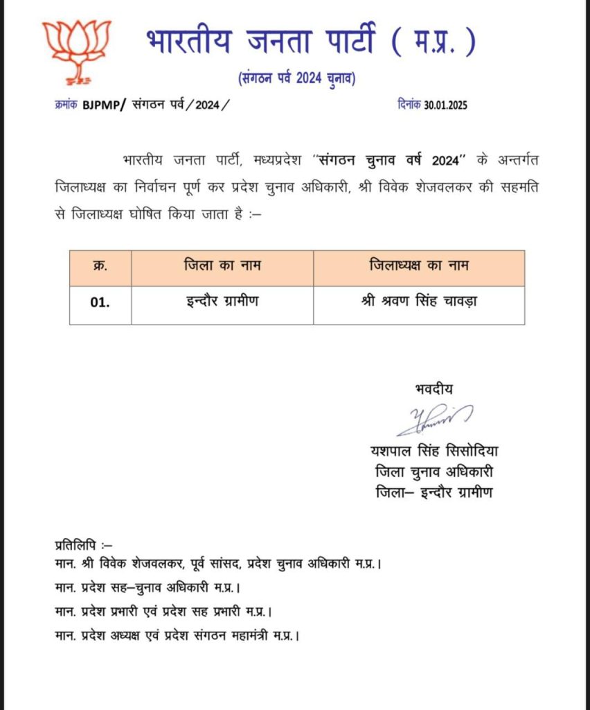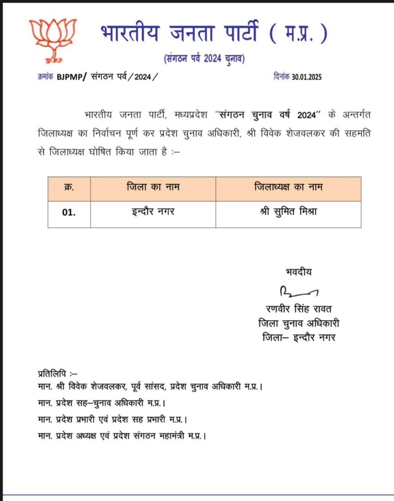 राकेश चतुर्वेदी, भोपाल। मध्यप्रदेश भारतीय जनता पार्टी ने दो जिला अध्यक्षों के नामों की घोषणा कर दी है। इनमें इंदौर नगर सुमित मिश्रा और श्रवण सिंह चावड़ा इंदौर ग्रामीण शामिल है। बड़े नेताओं के विवाद के चलते अब तक इंदौर जिला अध्यक्ष का नाम अटका हुआ था।